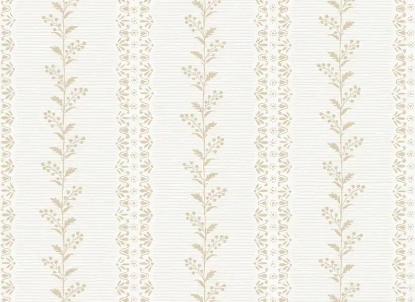 An elevated striped design with nods to nature. Wide columns of delicately lined detailing are overlaid with climbing, berry-laden vines and floral stamps for a scalloped interlude.