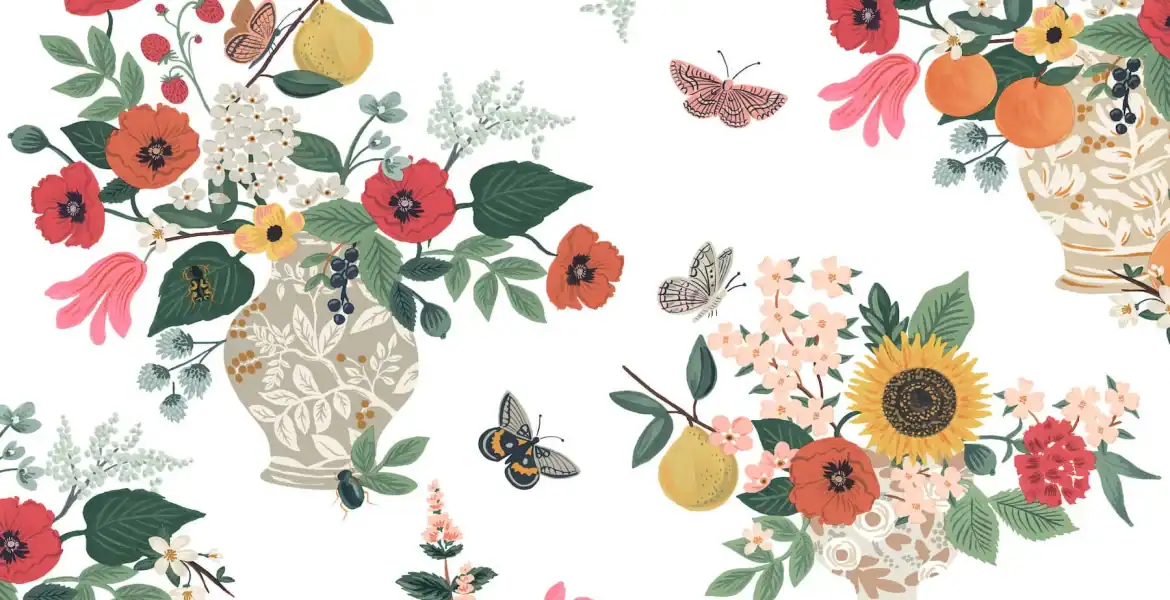 A sweet digital print design with bouquets of mixed flowers in ceramic vases. with fruit and butterflies.