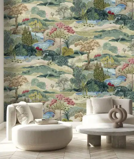 Disponible en plusieurs palettes évoquant les matins de printemps ou les après-midi d’été, ce panoramique de 4,9 m de large crée un environnement immersif et captivant, idéal pour transformer un salon ou une chambre en un sanctuaire de paix et d’élégance britannique.